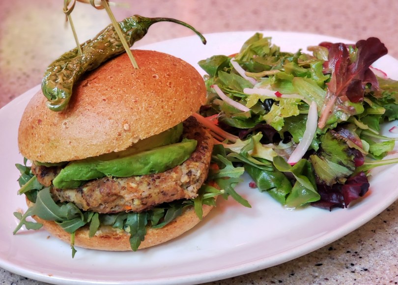 At the table service side of the restaurant, they have an artisan veggie burger, which is a house made vegan patty (bean and quinoa based), avocado, arugula, cilantro hummus, fried shallots, and heirloom tomatoes. Omit the basil aioli to make it vegan. The chef told us that the fried shallots, which come in packaging, they aren’t prepared in the restaurant, have on the ingredients list only shallots and palm oil. I opted out of those, so what you see pictured below is the burger with no aioli and no shallots.