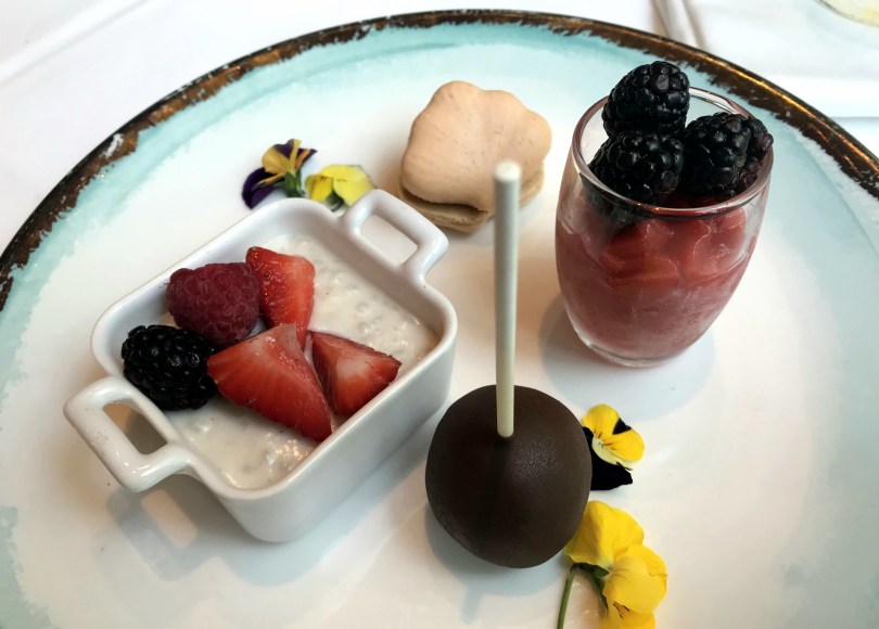 Dessert course was a tapioca pudding, cake pop, macaron, and watermelon sorbet: