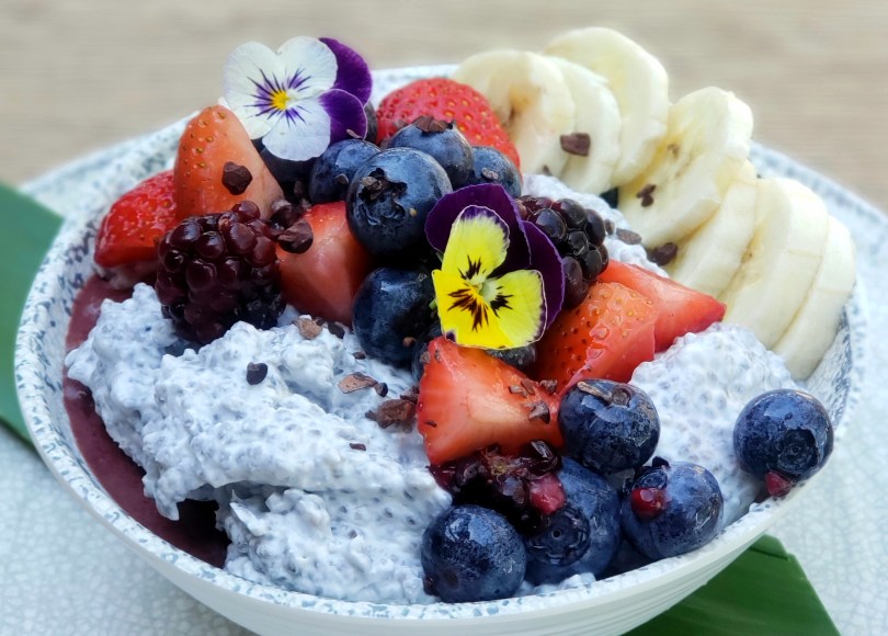 I absolutely loved this bowl, it has so many different textures and flavors. The açai smoothie on bottom, then the chia pudding on top, and then the berries, such a great combo. And the cocoa nibs give it a nice crunch!! And of course the edible flowers make it extra fancy!