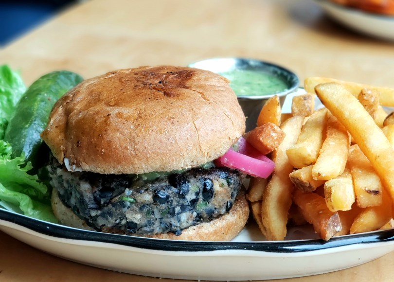 Pictured below is the Vegan Burger. It is a housemade quinoa patty, tomato, BBQ sauce, little gem lettuce, and housemade pickles, served with garlic herb fries:
