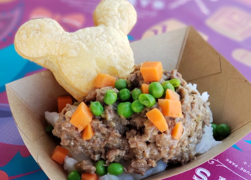 We’ll start with the Festival of Holidays in DCA. The new and probably most interesting dish is the Shepherd’s Upside-down Pie with Plant-based Ground Beef, which is available at the Grandma’s Recipes booth, as seen on the menu board below: