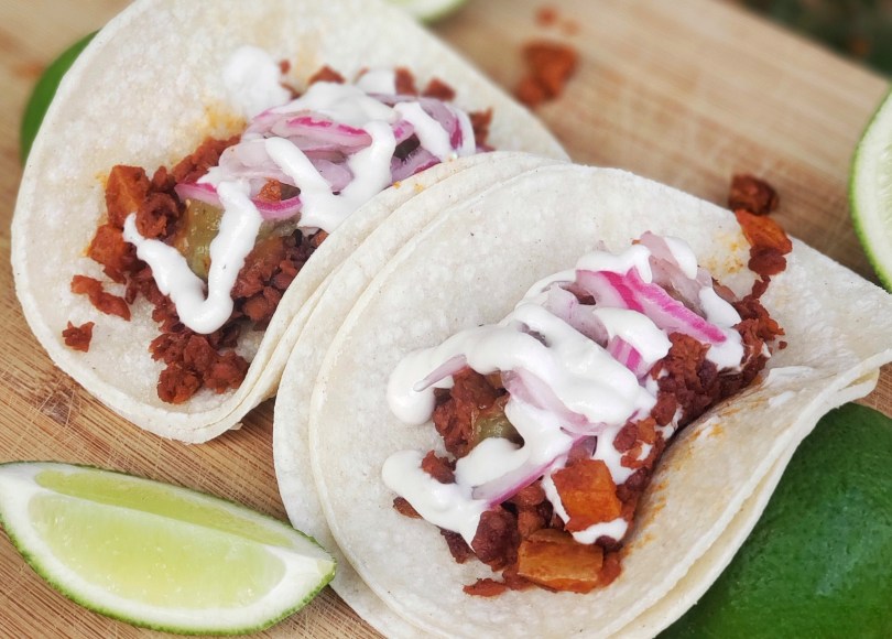 Place the potato/soyrizo filling into each taco, followed by the green salsa (about a tablespoon), and a few pieces of the pickled red onion. Drizzle the crema on top (I use a squeeze bottle), and serve with a lime wedge.