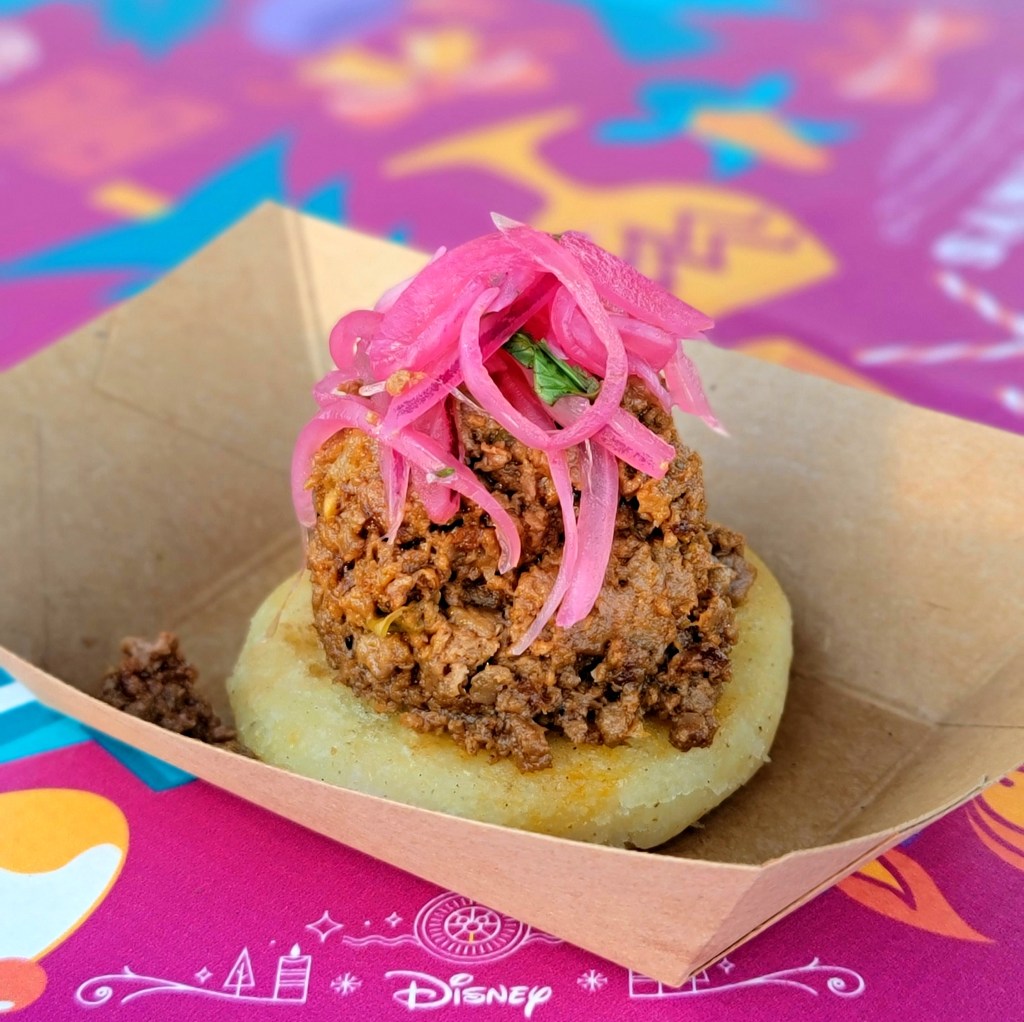 It has the corn-based arepa topped with seasoned Impossible meat and pickled red onions. It’s very savory and delicious! Zero spiciness that I could detect.