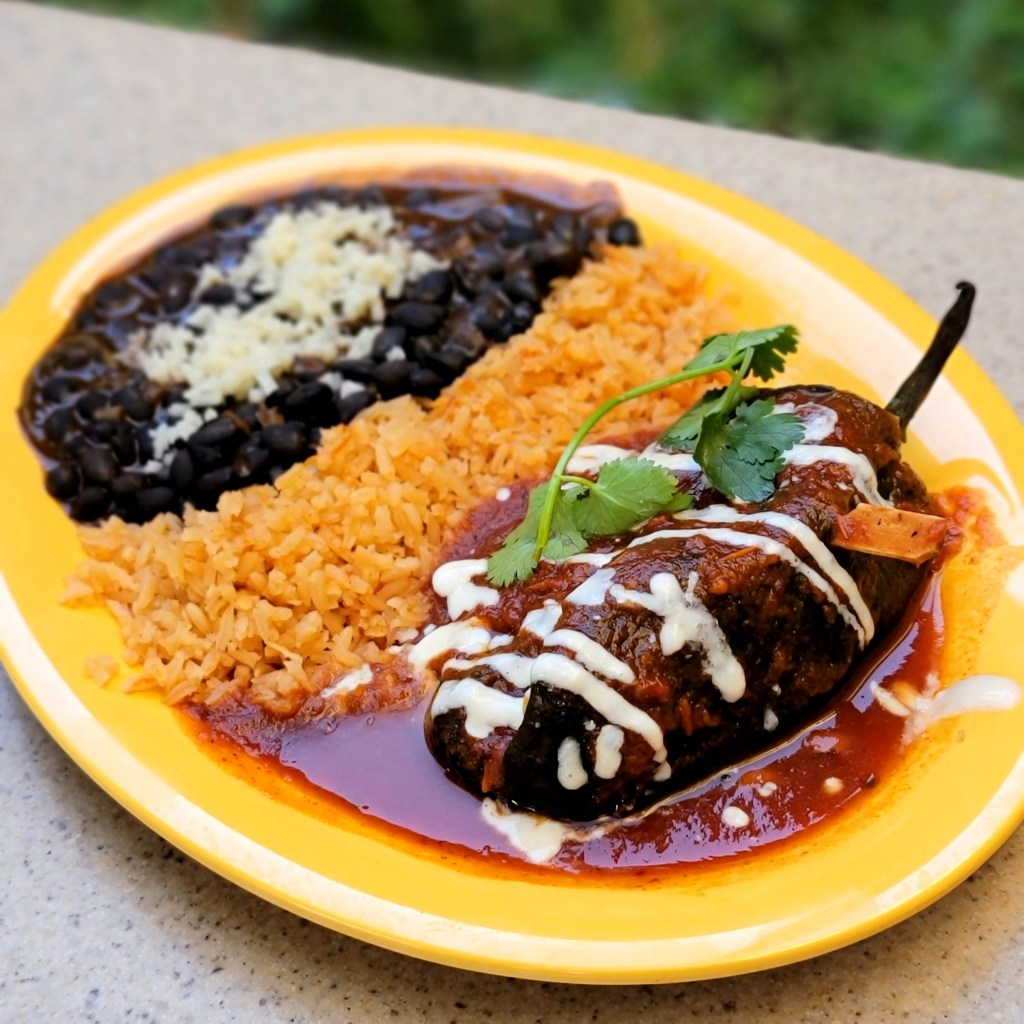 - Chile Relleno Plate – Roasted poblano stuffed with veggie stew topped with roasted tomato sauce and tofu crema served with Spanish rice and black beans (plant-based)