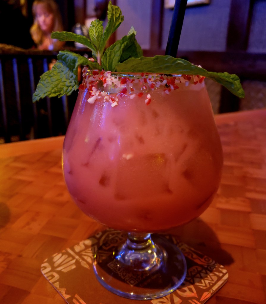- Peppermint Rum Cocktail – Rum, peppermint schnapps, ginger syrup, lemon juice, cream of coconut, mint leaves, and pomegranate juice garnished with a candy cane