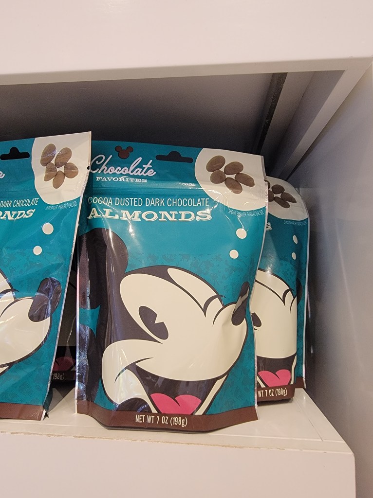 There are bagged chocolates in different varieties that all have this packaging with Mickey on them. The only vegan one is the Cocoa Dusted Dark Chocolate Almonds; all others contain milk.
