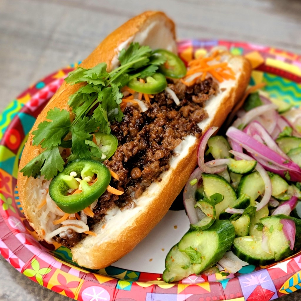 Here they have the Kid’s Impossible Banh Mi. It is like the adult version, but smaller, with no jalapeños, and it comes with steamed rice and veggies instead of the cucumber lemongrass salad. I don’t have a photo of the kids version, but here is a photo of the adult’s version to give you a general idea. Just imagine it about half the size, without the jalapeños, and with steamed veggies and rice.