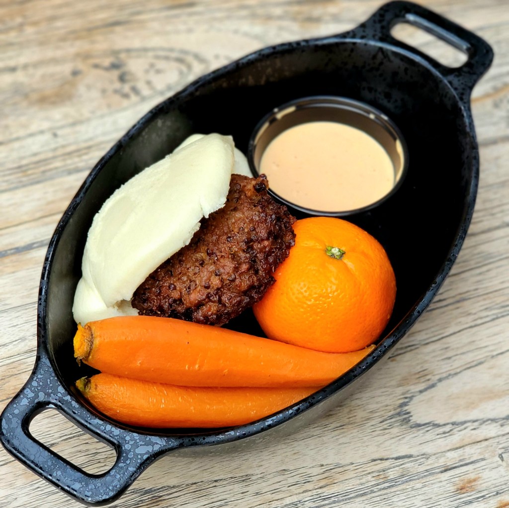 Here they have the Ithorian Garden Patty Bun, which consists of an Impossible/quinoa patty (same as the Felucian Kefta Meatballs in the adult vegan meal here) in a nice fluffy bun, a house-made vegan thousand island type sauce, steamed carrots, a cutie orange, and a beverage.